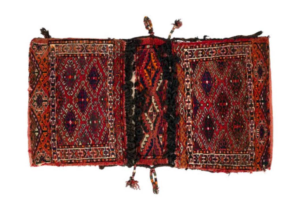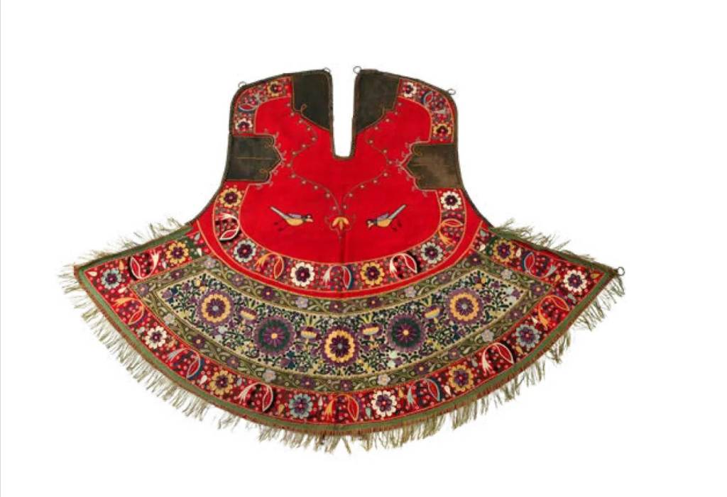 Yugan ham “Laqay va qo‘ng‘irotlarga oid yarim ko‘chmanchi qabilalarning kashtachilik san’ati” bo‘limida tasvirlangan naqshli buyumlarni eslatuvchi, ammo qo‘y va echki junidan to‘qilgan ensiz panellardan yig‘ilgan. Ot lo‘njidagi va qanshari bo‘ylab to‘qilgan qo‘shimcha matolar ko‘plab ilgaklar bilan naqsh ko‘rinishida bezatilgan. Qanshar va chakka qismi to‘q qizil rangdagi baxmaldan qilingan. Bu qismlar kauri chig‘anoqlari, feruza munchoqlar va osma shokilalar bilan bezatilgan.